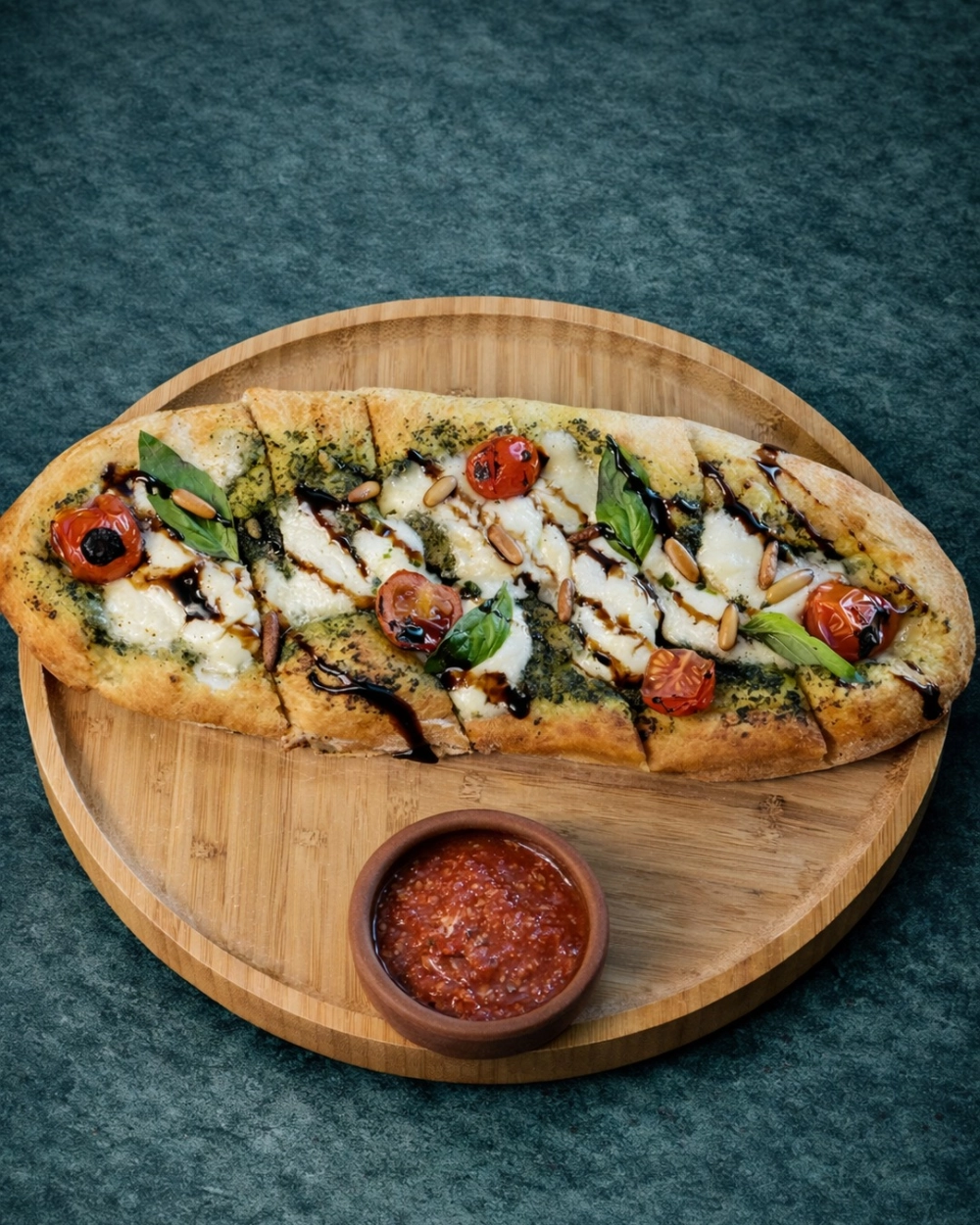 Arisan Flatbread Topped With Melted Cheese, Aromatic Basil Pesto, Roasted Cherry Tomato Toasted Pine Nuts & Balsamic Glaze, Served with Pomodoro Sauce.
