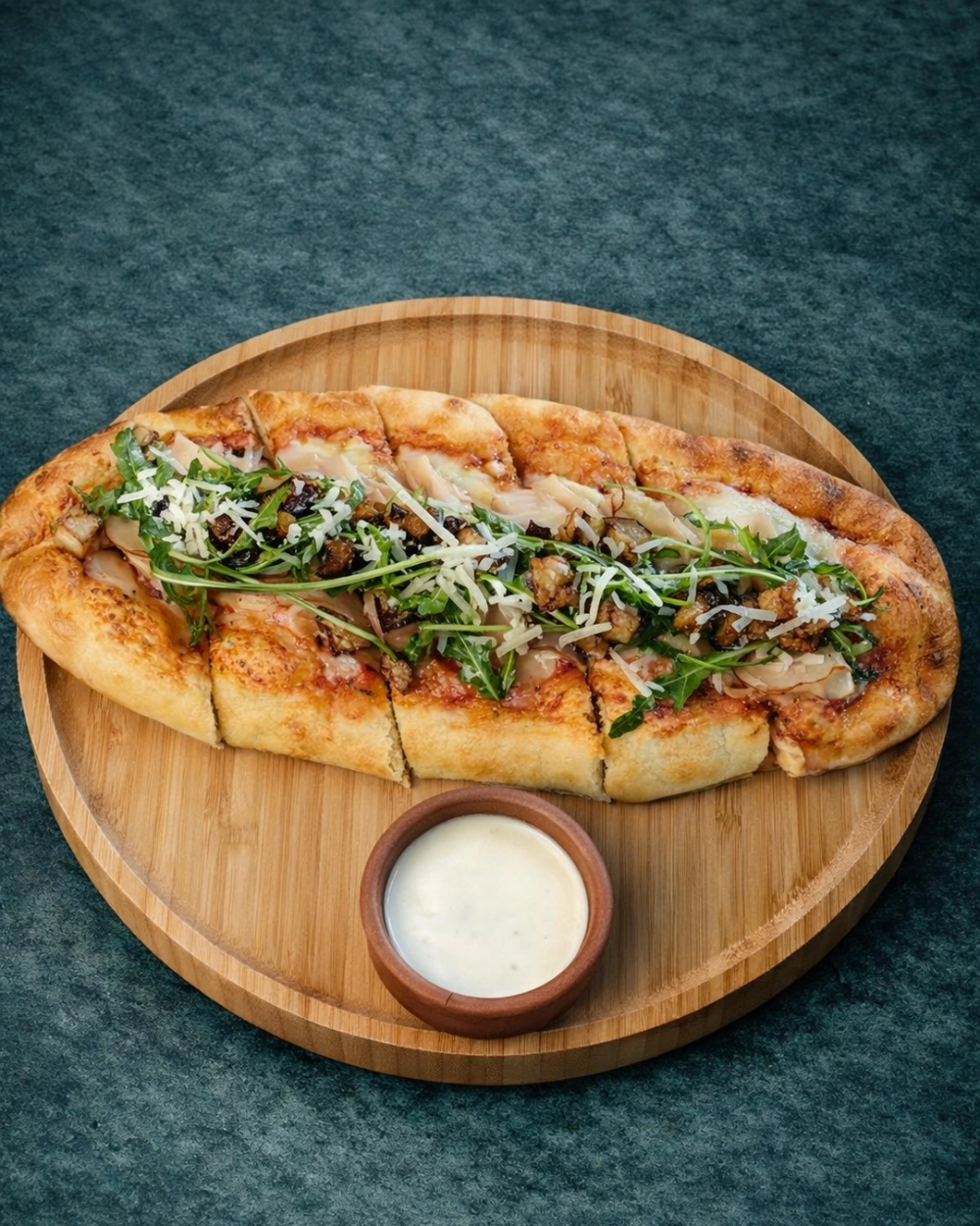 Oven Baked Artisan Flatbread Topped with Tender, Turkey Slices & Melted Cheese, Finished with Greens, Served with Cheese Sauce.
