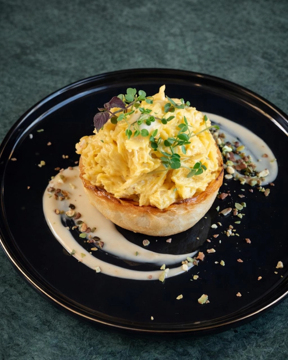Fluffy Golden Scramble Eggs Served In a Warm Buttery Brioche Bun.