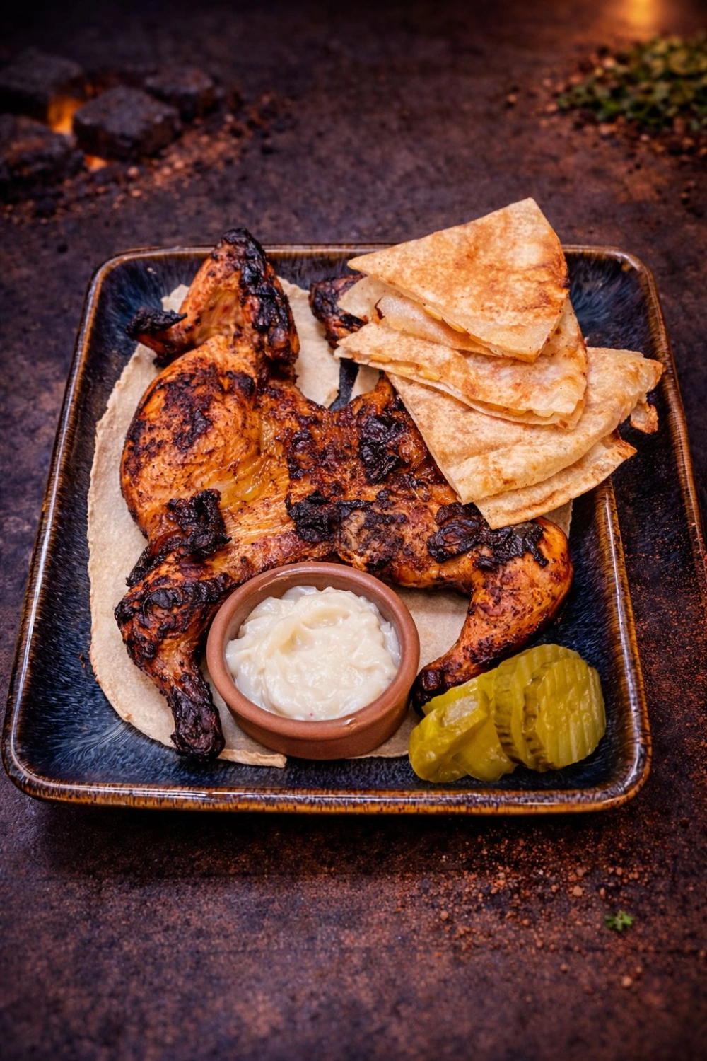 Grilled Chicken Served with Dillpickles, Garlic & Garlic Potato Bread