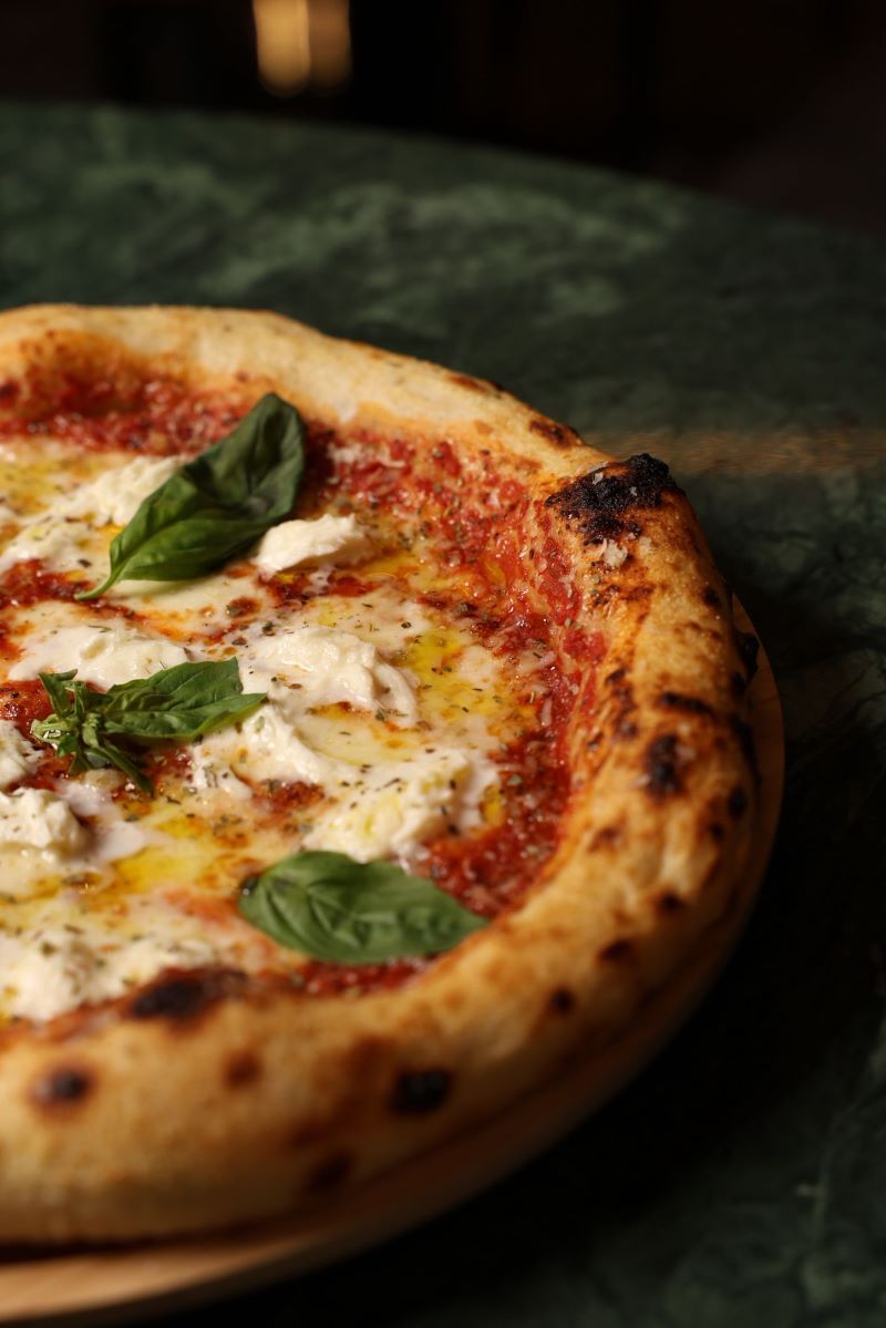 Tomato sauce, parmesan, fresh mozzarella, burrata cheese, basil.