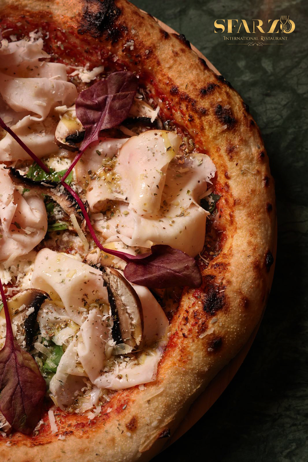 Tomato sauce, parmesan, fresh mozzarella, turkey, fresh mushroom.