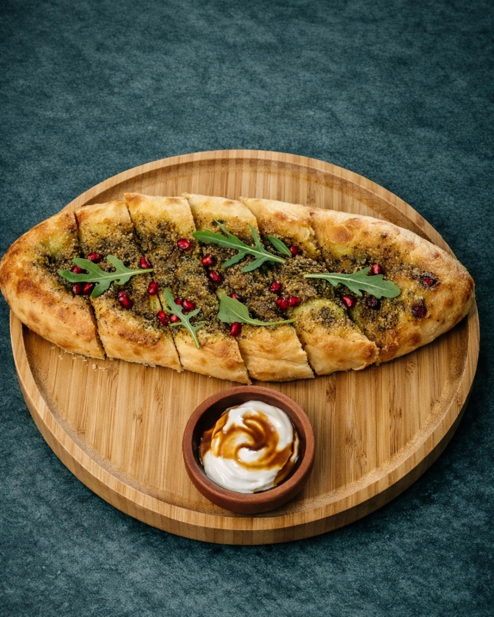 A Traditional Middle Eastern Flatbread Topped with a Vibrant Blend Of Zaatar (Thyme, Sumac & Toasted Sesame) Mix with Olive Oil. Served With Home Made Labneh.